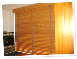 木製のスラットを使ったブラインド。木の板の壁と雰囲気が合うように、同じような色、素材のブラインドを探しました。自然の素材なので心が落ち着きます。