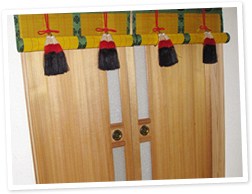 「御簾(みす)」とは、神社仏閣などにかけらている細かい細工が施されたすだれのこと。かつては貴族の住まいに使われていました。仏間という家の中で最も神聖な空間に御簾をかけたいというご要望をいただき、取付を行いました。