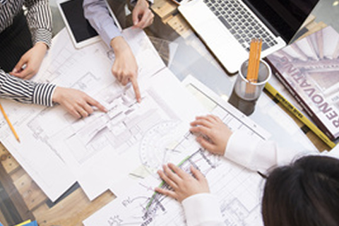 原状回復工事で大切なのは、元の構造に傷をつけずに解体していくこと。それには、設計図を読み込み、現状をきちんと把握して、どのように解体すれば効率よくできるかを検討することが必要です。施工経験を活かし、どの部分が店舗開店のために取り付けられた部分かを把握し、無駄のない工事をプランニングします。